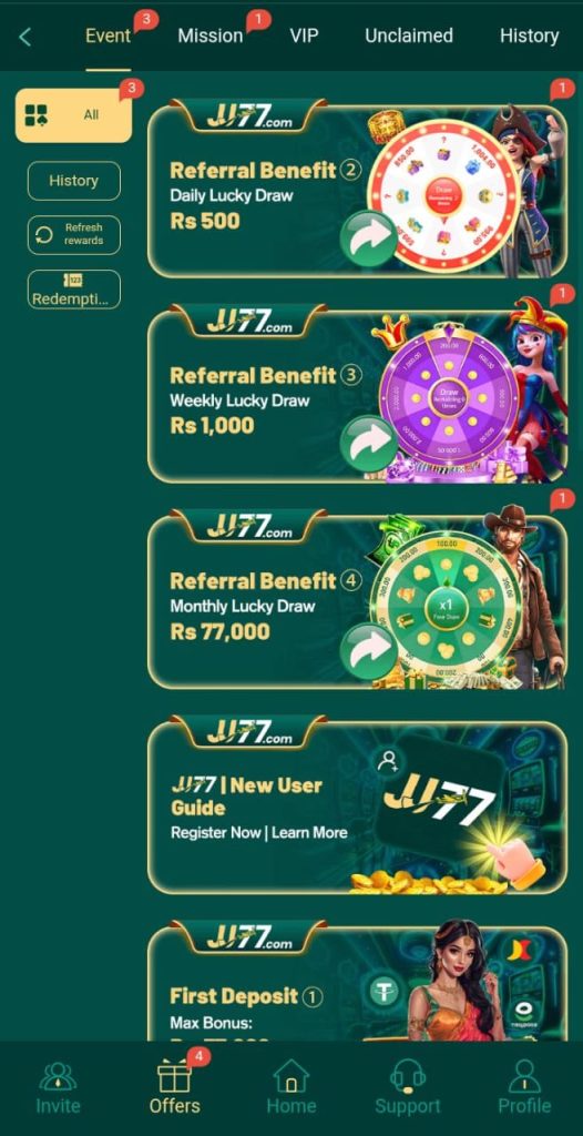 JJ77 Game allows users to invite friends using a referral code. When friends join and play, both users receive bonus rewards, which helps increase earnings.